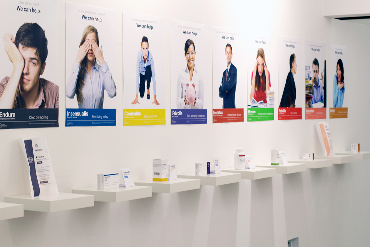 The posters and packages provide a commentary on how pharmaceutical companies use context and marketing to construe normal behaviors as abnormal and treatable conditions. This skewing of definition has, in turn, slowly diminished the concept that any individual is normal.